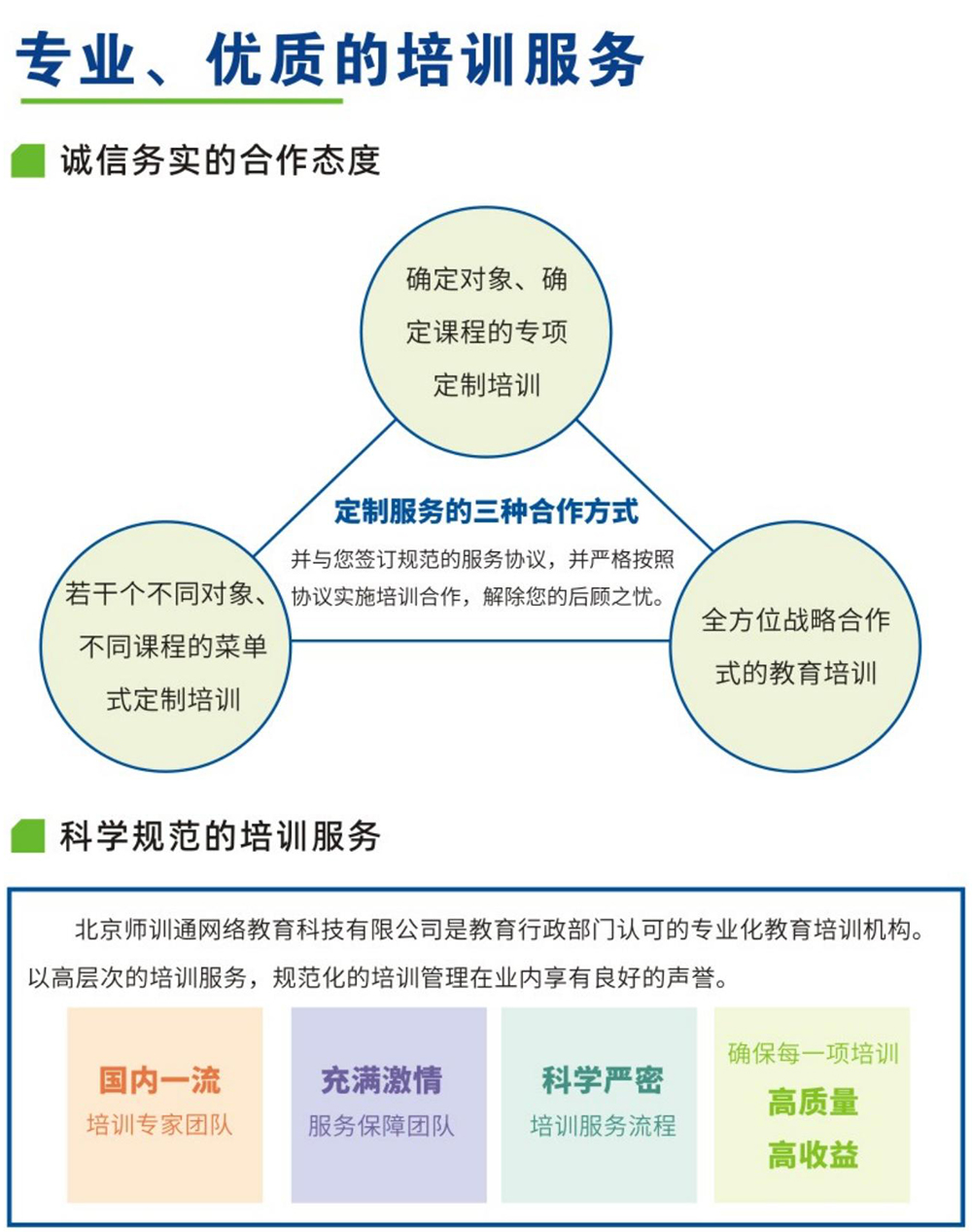 憑借國(guó)內(nèi)一流的培訓(xùn)專家團(tuán)隊(duì),雄厚的科研基礎(chǔ)和文化實(shí)力,秉承“專業(yè)專 注、盡心盡力、盡職盡責(zé)”的服務(wù)理念,北京師訓(xùn)通網(wǎng)絡(luò)教育科技有限公司長(zhǎng)期 為全國(guó)各市、縣(區(qū))教育局和中小學(xué)校教師、學(xué)生,提供前沿、全面、優(yōu)質(zhì)、專業(yè)化的各類定制培訓(xùn)及全國(guó)各地名校參觀考察、名牌大學(xué)高級(jí)研修!